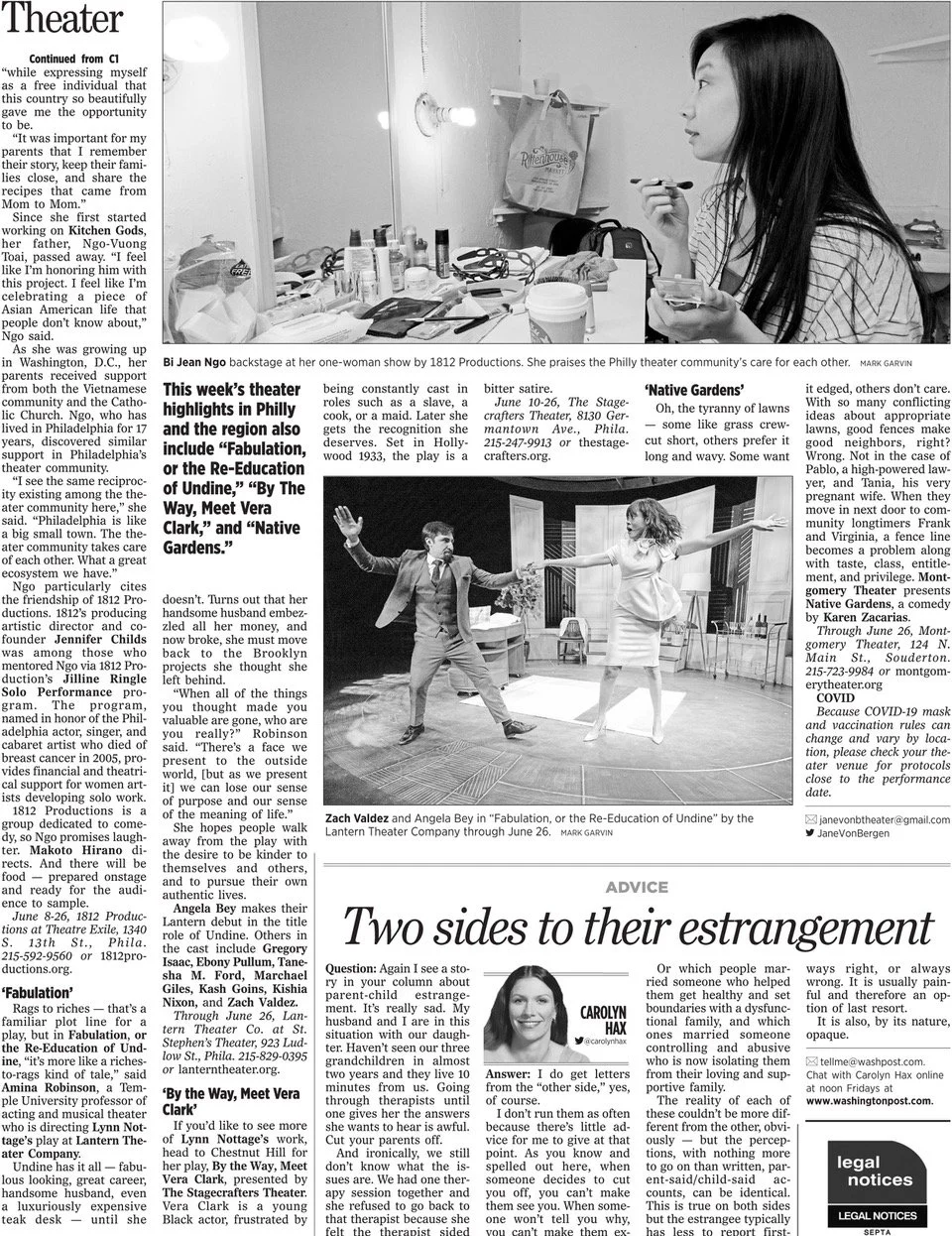 Ngo particularly cites the friendship of 1812 Productions. 1812′s producing artistic director and cofounder Jennifer Childs was among those who mentored Ngo via 1812 Production’s Jilline Ringle Solo Performance program. The program, named in honor of the Philadelphia actor, singer, and cabaret artist who died of breast cancer in 2005, provides financial and theatrical support for women artists developing solo work.