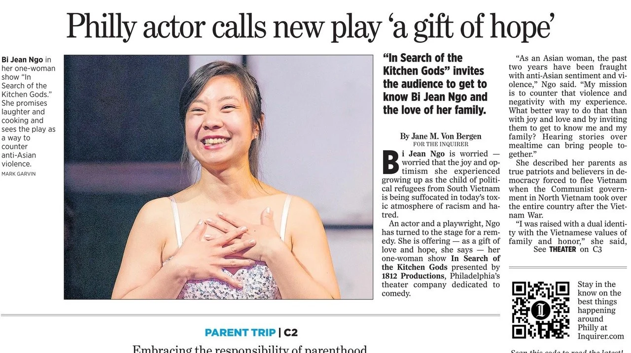 An actor and a playwright, Ngo has turned to the stage for a remedy. She is offering — as a gift of love and hope, she says — her one-woman show In Search of the Kitchen Gods presented by 1812 Productions, Philadelphia’s theater company dedicated to comedy.